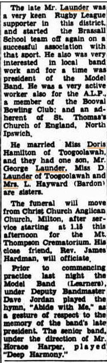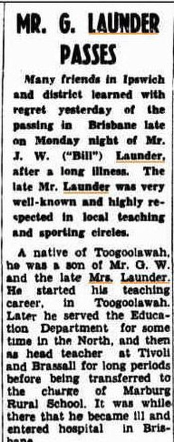 OBITUARY – MRS. G. LAUNDER, TOOGOOLAWAH - January 15Mrs. A. Launder, who died recently, was the fifth daughter of the late Mr. and Mrs. John Harris, of Denmark Hill, Ipswich, where she was born.Mrs. Launder had resided for 48 years at Toogoolawah. she is survived by her husband, one son, Mr. John W. (Bill) Launder (Brassall), and two daughters, Miss Doris Launder (Toogoolawah) and Mrs. L. Hayward (Bardon, Brisbane). Of the Harris family of six daughters and four sons, only Mrs. M. A. Upton, of Graceville, is still living.Queensland Times (Ipswich, Qld. : 1909 - 1954), Wednesday 16 January 1952