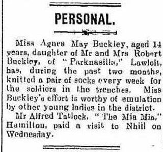 Name: Agnes May BuckleyBirth Date: Abt 1903Birth Place: Kaniva, VictoriaRegistration Year: 1903Registration Place: Victoria, AustraliaFather: Robt Darlington BuckleyMother: Mabel May WarrenRegistration Number: 26492ANCESTRY.COM. AUSTRALIA, BIRTH INDEX, 1788-1922