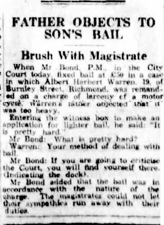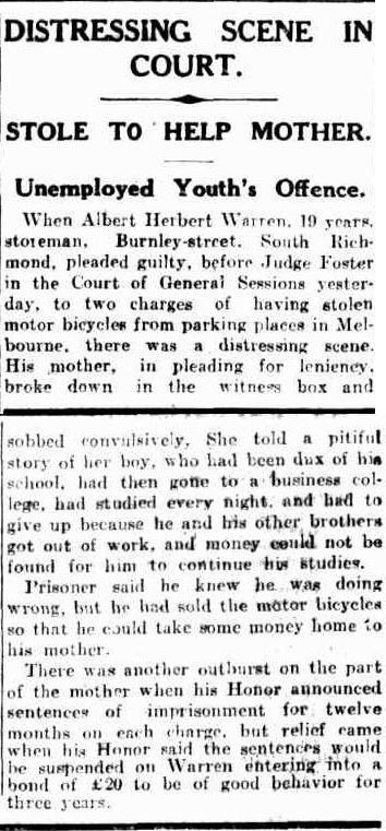 Life must have been tough in the Warren household at this time. For, Albert, in endeavouring to lessen the burden on his parents, stole motor bikes whilst they were parked in Melbourne with a view to selling them for the money which he intended to give to his mother. Burdett, his mother, pleaded with the court for leniency for her youngest son and was stricken when the judge sentenced the young 19 year old lad to 12 months imprisonment. Thanks to Burdett's pleas, the sentence was suspended in lieu of a bond of £20 on condition that Albert be on good behaviour for the next three years.