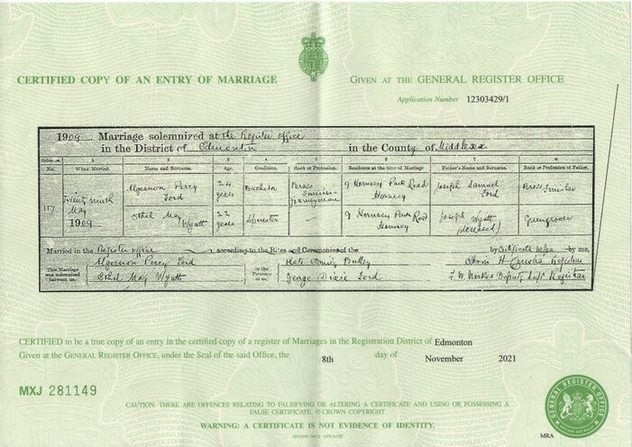 Name: Ethel May WyattRegistration Year: 1909Registration Quarter: Apr-May-JunRegistration district: EdmontonInferred County: MiddlesexVolume: 3aPage: 1095Name: Algenon Percy FordEthel May WyattSource: England & Wales, Civil Registration Marriage Index, 1837-1915 ancestry.com