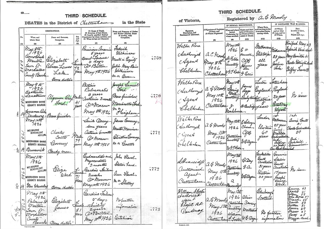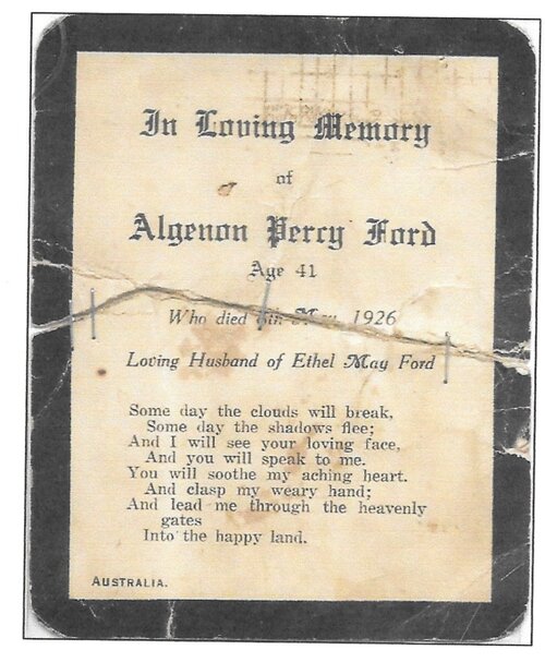 Algenon Percy Ford succumbed to the metal industry disease, tuberculosis, at the Heatherton Sanitorium in Cheltenham on May 9, 1926, leaving his wife Ethel May Ford. They had no children.