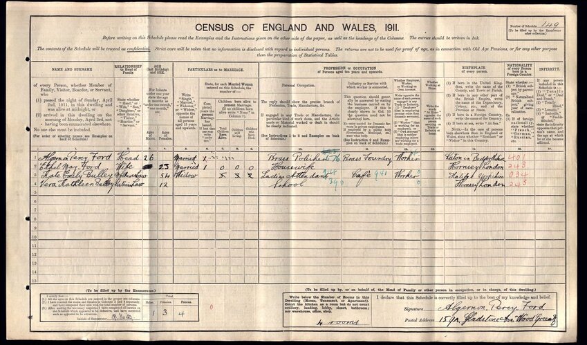 Algenon Percy Ford was living with his wife, Ethel May Ford, his mother-in-law, Kate Bulley and his sister-in-law, Vera Kathleen Bulley at 159 Gladstone Avenue, Wood Green. Algernon was 26 years old and working as a brass polisher at a brass foundry. Ethel May was 23 years old and a housewife. Ethel’s mother, Kate Emily Bulley, was 54 years old, a widow and working as a Ladies’ Attendant at a Café. And Vera Kathleen Bulley, just 12 years old, was still at school.