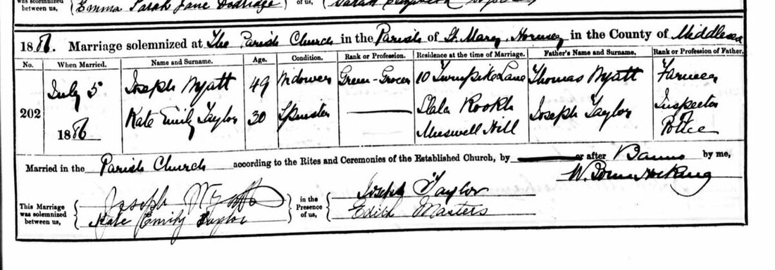 Ethel’s parents, Joseph Wyatt, 49 years, a widower and Kate Emily Taylor, 30 years, a spinster, married on July 3, 1816. Joseph was a Green-grocer and Kate’s father was a Police Inspector.
