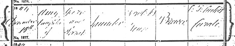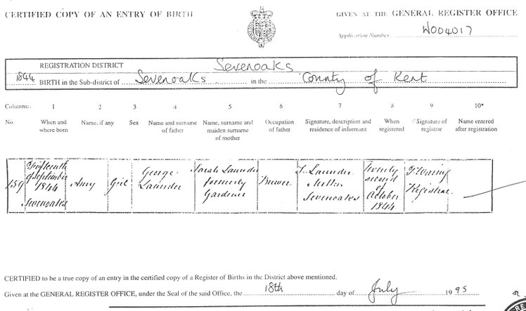 On December 15, 1844, Amy Launder was baptised in the Parish of Sevenoaks, Kent. Her parents were George and Sarah Launder