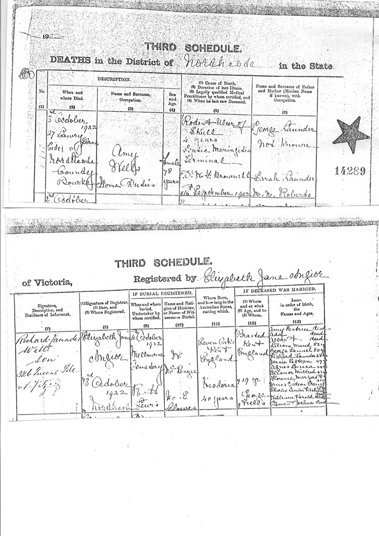The informant was Robert Launder Wells, her son, who lived at 326 Queens Parade, in North Fitzroy. Amy was buried the day after her death at the Melbourne Cemetery.