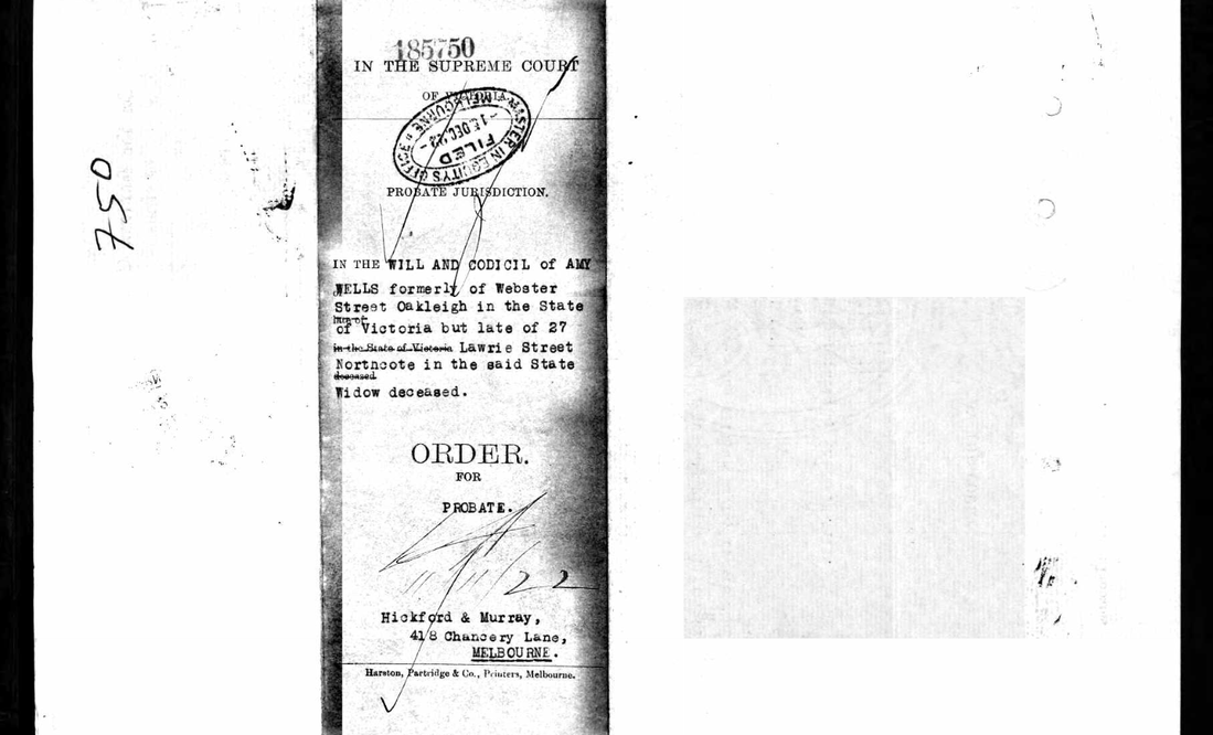 JUDICIAL AND LAW NOTICESNotice is hereby given that after the expiration of fourteen days from the publication hereof application will be made to The Supreme Court of the State of Victoria, in its Probate jurisdiction that PROBATE of the WILL and codicil of AMY WELLS formerly of Webster Street, Oakleigh and in the said State but late of 27 Lawrie Street, Northcote in the said State, widow, deceased may be granted to Richard Launder Wells of Queens Parade Clifton Hill in the said State, fruiterer, and William Murray, of 4128 Chancery Lane, Melbourne in the said State, solicitor the executors named in and appointed by the said will.Dated the eighteenth day of October, 1922HICKFORD AND MURRAY418 Chancery Lane, Melbourne, proctors for the applicantsThe Argus newspaper, October 19, 1922