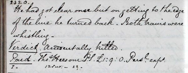 Jesse however, new at the job, at first warning leapt the wrong way, then back again, right into the path of the first oncoming train. His body was flung into the path of the second oncoming train, leaving him instantly dead with serious head injuries.