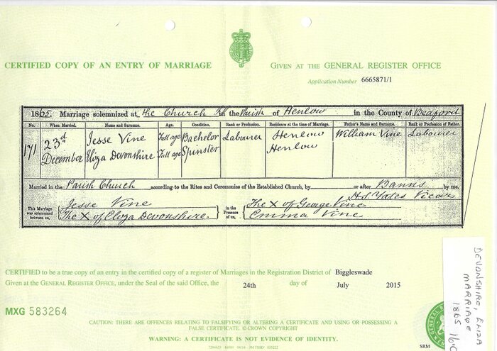 The following year in 1865, her mother married Jesse Vine who was possibly our Annie Eliza's father, although Annie Eliza kept the surname of Devonshire and did not take Jesse Vine's name after her mother's marriage.