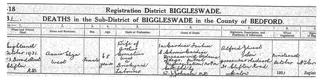 Annie Eliza West, nee Devonshire, died on 18th October, 1931 at home at 53 Broad Street, Clifton. Her son, Alfred J. West was present at her death and was the informant. His address at the time was 31 Clifton Road, Henlow.