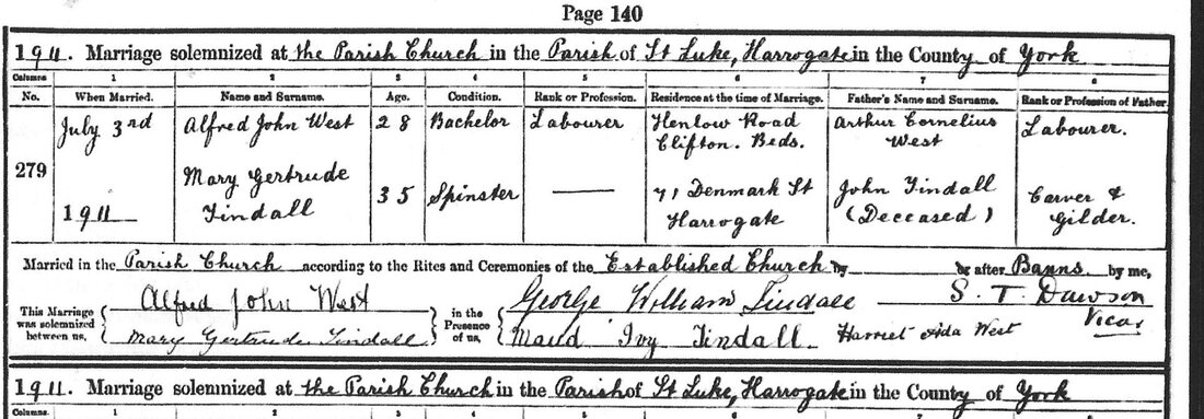 Alfred John West, 28 years old, bachelor, labourer of Henlow Road, Clifton,Father Arthur Cornelius West, labourer,Married Mary Gertrude Tindall, 35 years old, spinster, 71 Denmark Street, Harrogate,Father John Tindall (deceased), carver and gilder.