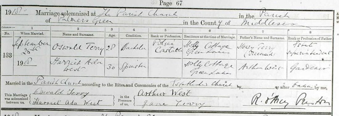 Harriet married on September 15 in 1918 at Palmers Green, St. John the Evangelist Church in Enfield. Her husband was Oswald Terry, a police constable. He was 28 years old and his father was Henry Terry (deceased).