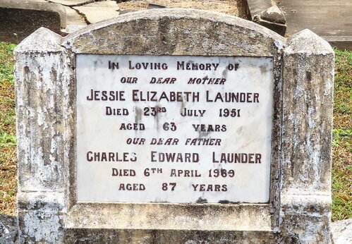 Name: Charles Edward LaunderBirth Date: 9 Jun 1881 Death Date: 6 Apr 1969Cemetery: Mackay City CemeteryBurial or Cremation Place: Mackay, Mackay Region, Queensland, AustraliaSpouse: Jessie Elizabeth LaunderAncestry.com. Australia and New Zealand, Find a Grave Index, 1800s-Current