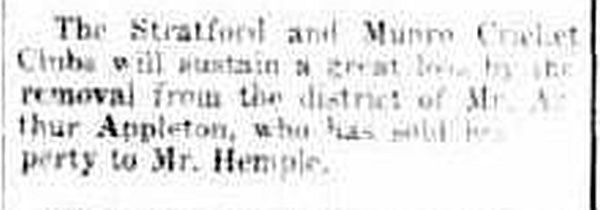 Transcript: The Stratford and Munro Cricket Clubs will sustain a great loss by the removal from the district of Mr. Arthur Appleton, who has sold his property to Mr. Hemple.