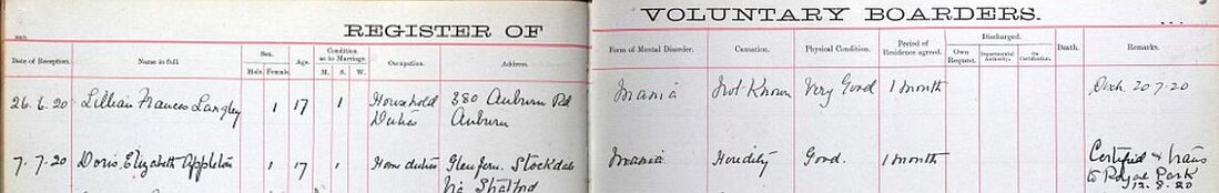 Date of Reception 7 . 7. 20Name in Full Doris Elizabeth AppletonSex FemaleAge 17Condition as to Marriage SingleOccupation Home DutiesAddress Glenfern, Stockdale via StratfordForm of Mental Disease ManiaCausation HereditaryPhysical Condition GoodPeriod of Residency Agreed 1 monthRemarks Certified & Transferred to Royal Park 12. 8. 20