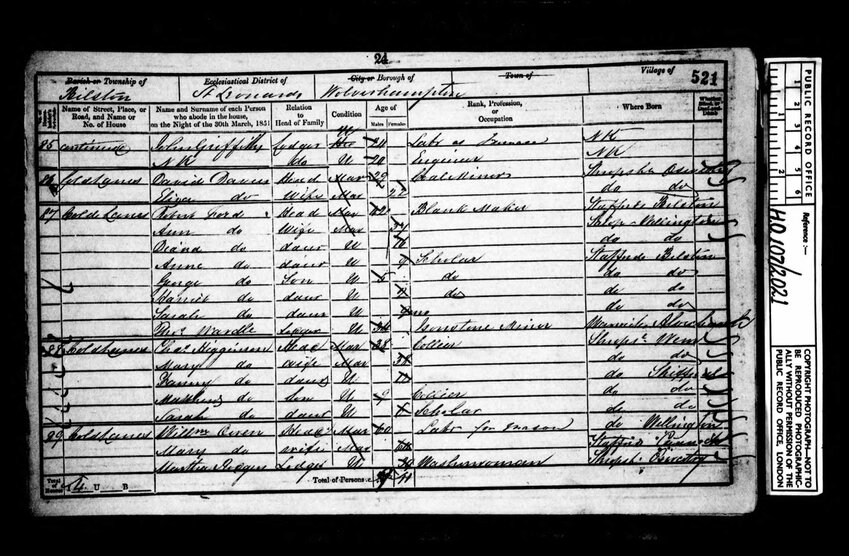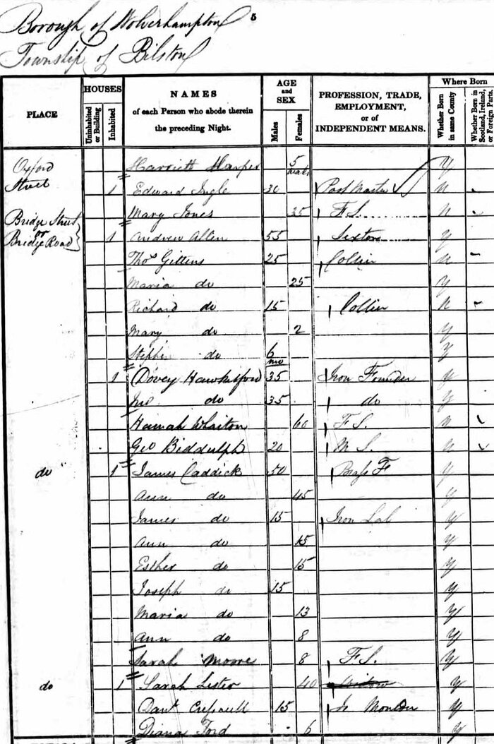 1851 - Cold Lanes, Bilston1861 - Sir Charles ??, Bilston1871 - 59 Mansel House, Wellenhall Road, Bilston1881 - Old Hall Buildings, Bilston1891 - 35 Willenhall Road, Bilston1901 - 167 Wellenhall Road, Bilston1911 - 26 Becket Street, Bilston