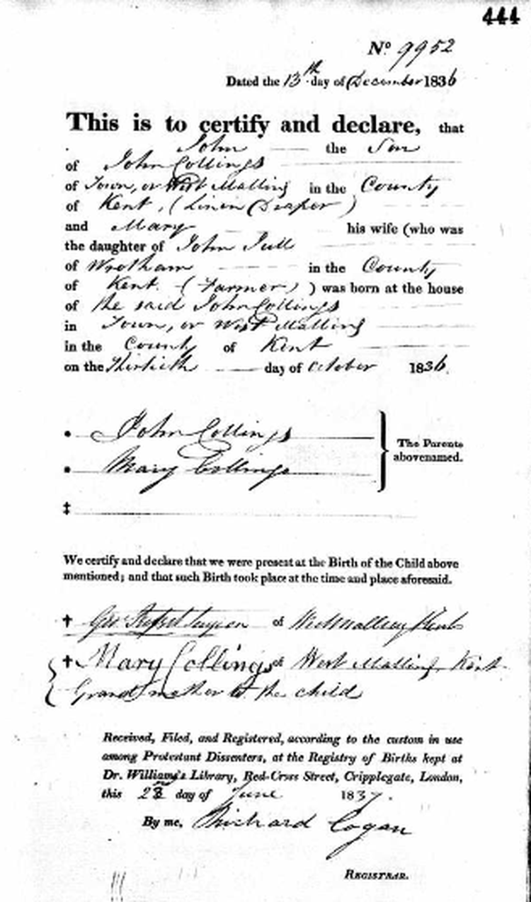 John’s parents, John Collings and Mary Jull, were living in West Mailing in Kent when their baby boy named after his father was born on October 30 in 1836. The baby was born at home and to prove his birth, a certificate was completed to certify his birth details. Persons present at the birth included his grandmother, Mary Collings.