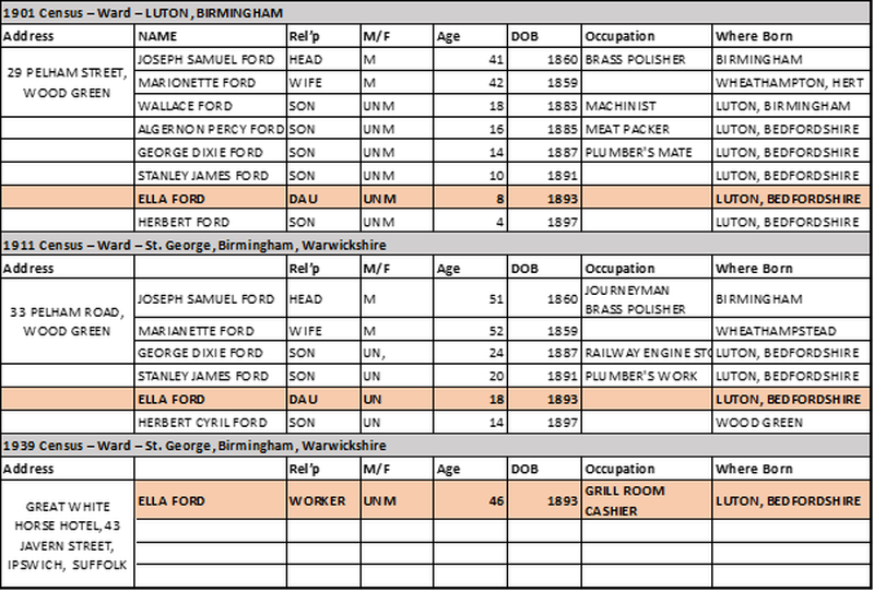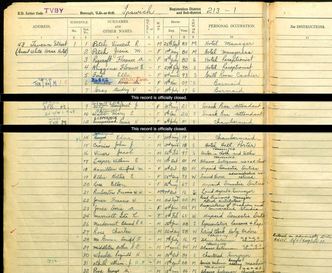 By 1939, Ella was 46 years old, unmarried and working at the Great White Horse Hotel at 43 Tavern Street in Ipswich as the Grill Room Cashier.
