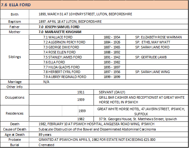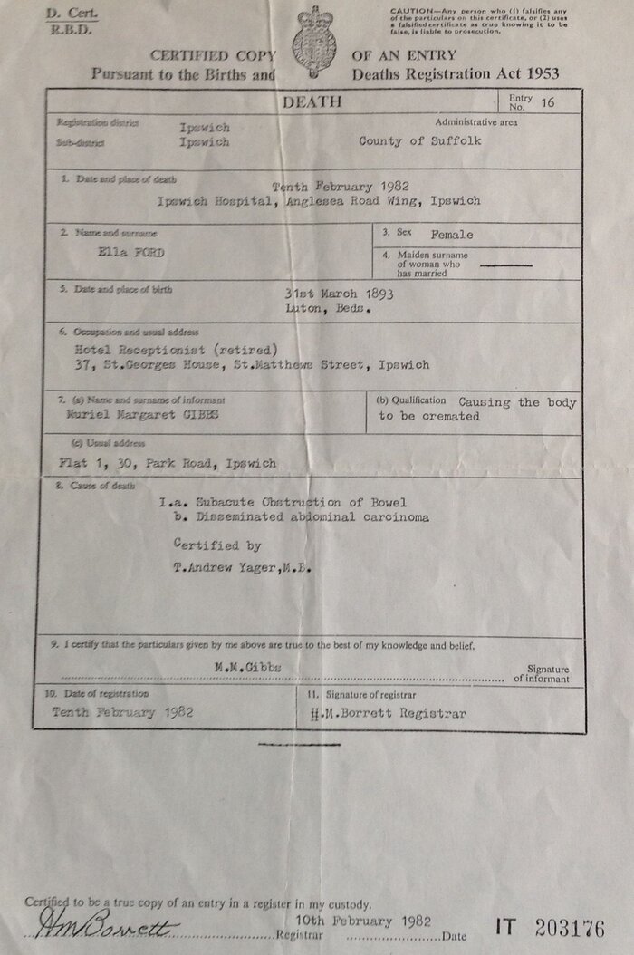 Ella Ford died aged 89 years old. She had retired from her job as a receptionist at the hotel and was living at 37 St.Georges House, St. Matthews Street, Ipswich.