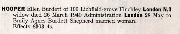1940 - Probate - Ellen Burdett Hooper, nee Salisbury Name Ellen Burdett HooperRegister Type BurialDeath Date abt 1940Burial or Cremation Date 27 Mar. 1940Burial or Cremation Place CamdenSource : UK, Burial and Cremation Index, 1576-2014