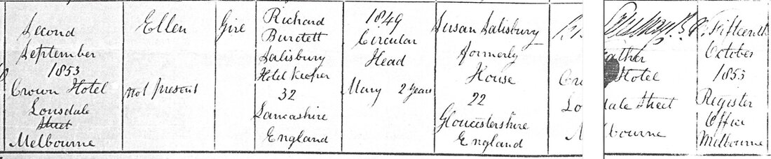 Born September 2, 1853 at the Crown Hotel, Londsdale Street, MelbourneFather : Richard Burdett Salisbury, Hotel Keeper, aged 32 years, Birth Place, Lancashire, EnglandMother : Susan Salisbury, formerly House, aged 22 years, Birth Place, Glocestershire, EnglandParents Marriage : 1849, Circular HeadOther Children : Mary 2 yearsBirth Registered October 15, 1853 at Melbourne