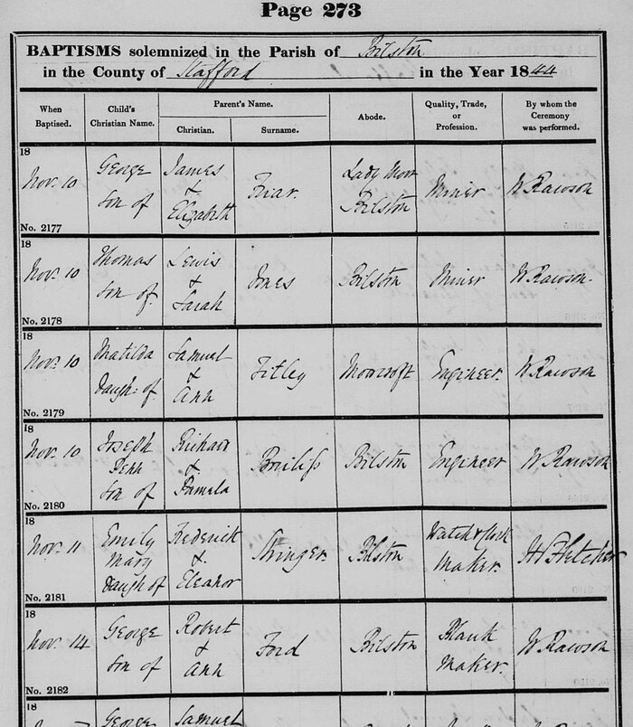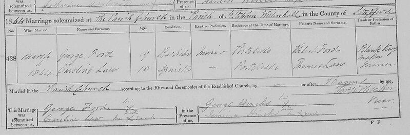 Name George FordBorn 1844 at Wolverhampton, StaffordshireBaptism 1844, November 14 at St. Leonard's Church, Bilston, StaffordshireMarriage 1864, March 6 at St. Stephen's Church, Willenhall, StaffordshireSpouse Caroline Law