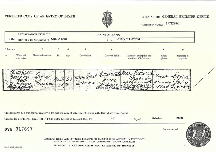 George Kingham died at the age of 43 years in 1869 on December 31. At the time of his death he was living in the Union Workhouse in Saint Albans. He developed a severe fever – brought on by an infection or other disease perhaps – and was taken to the Workhouse Infirmary where he died in the presence of a stranger after 18 days of his illness.