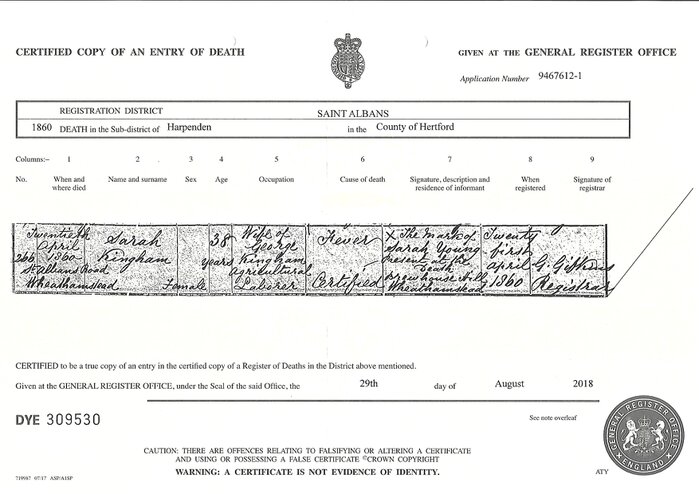 Not long after the birth of her daughter, Marianette, Sarah Kingham, nee Nash died of fever, probably associated with the recent birth. Sarah died on April 20, 1860 at their home at St. Albans Road, Wheathamstead. She was 38 years old and the wife of George Kingham, agricultural labourer. Sarah had been married for just seven years, had given birth to at least four children, all of whom she had buried as babies except her last child, her daughter, Marianette. Present at her death was a woman named Sarah Young. Was this woman related to either George or Sarah?