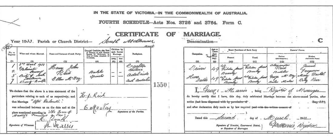 1933 Marriage Certificate for Henry John Reid and Ellen McNay
