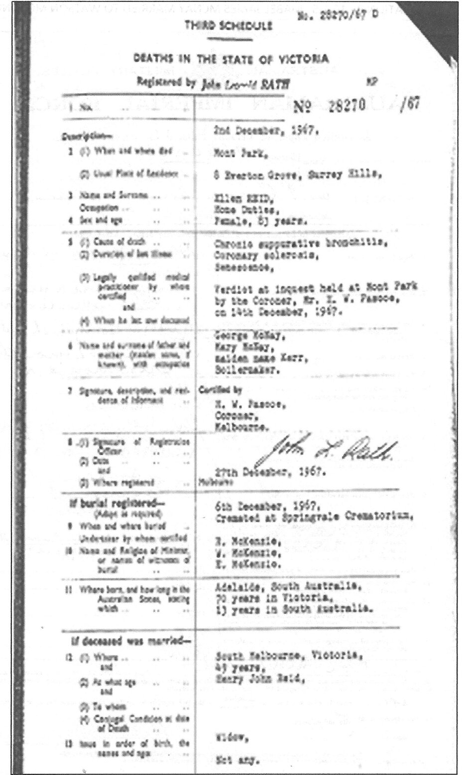 Age at Death 83 yearsCause of Death Chronic Suppurative Bronchitis; Coronary SclerosisCremation 1967, December 6 at Springvale Crematorium, VictoriaChildren 1. Bonnie Reid (1915 - 1986)