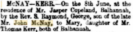 McNAY - KERROn the 8th June at the residence of Mr. Jasper Copeland, Balhannah, by the Rev. S. Raymond, George, son of the late Mr. John McNay, to Mary, daughter of Mr.Thomas Kerr, both of BalhannahSource : The Adelaide Observer newspaper, June 13, 1874