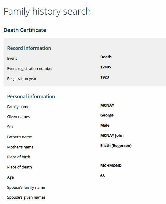 DEATH - McNAYOn 16 August 1923 at his residence 70 Madden Grove Richmond, George McKay loving father of George, Elizabeth, Ellen, Mabel, Bella, and Hilda, age 68 yearsAt restFUNERAL - McNAYThe friends of the late George McNay are invited to follow his remains to the place of internment in the Burwood Cemetery.The funeral will leave his late residence 70 Madden Grove Richmond this day August 16 Saturday.Source : The Argus newspaper, August 18, 1923