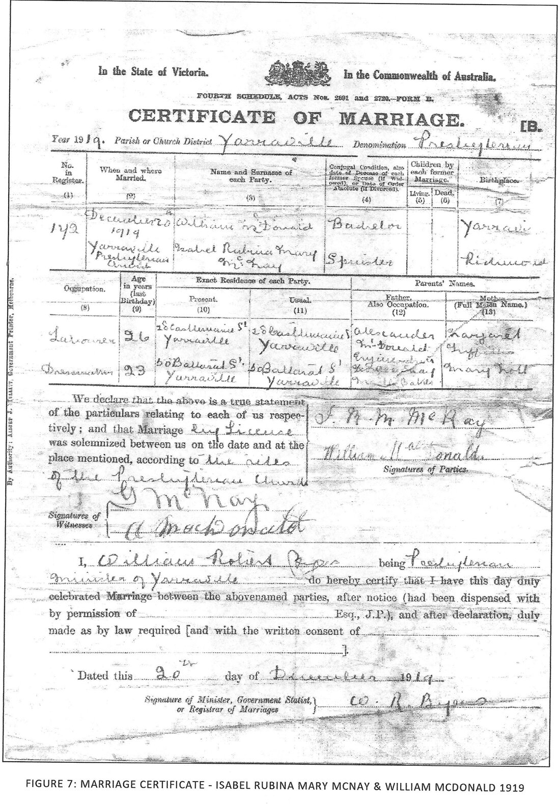 Residences 1931 - 309 Barkly Street, FootscrayBorn 1896 at Richmond, VictoriaFather George McNayMother Mary Robina NottMarriage 1919, December 20 in VictoriaSpouse William McDonaldBorn 1893 in Footscray, VictoriaOccupation FishmongerDeath 1939 in Campbellfield, VictoriaAge at death 46 years1936 - 400 Mitcham Road, VermontDeath 1953, December 5 at South Yarra1942 - 34 Morang Road, Hawthorn (with son William)