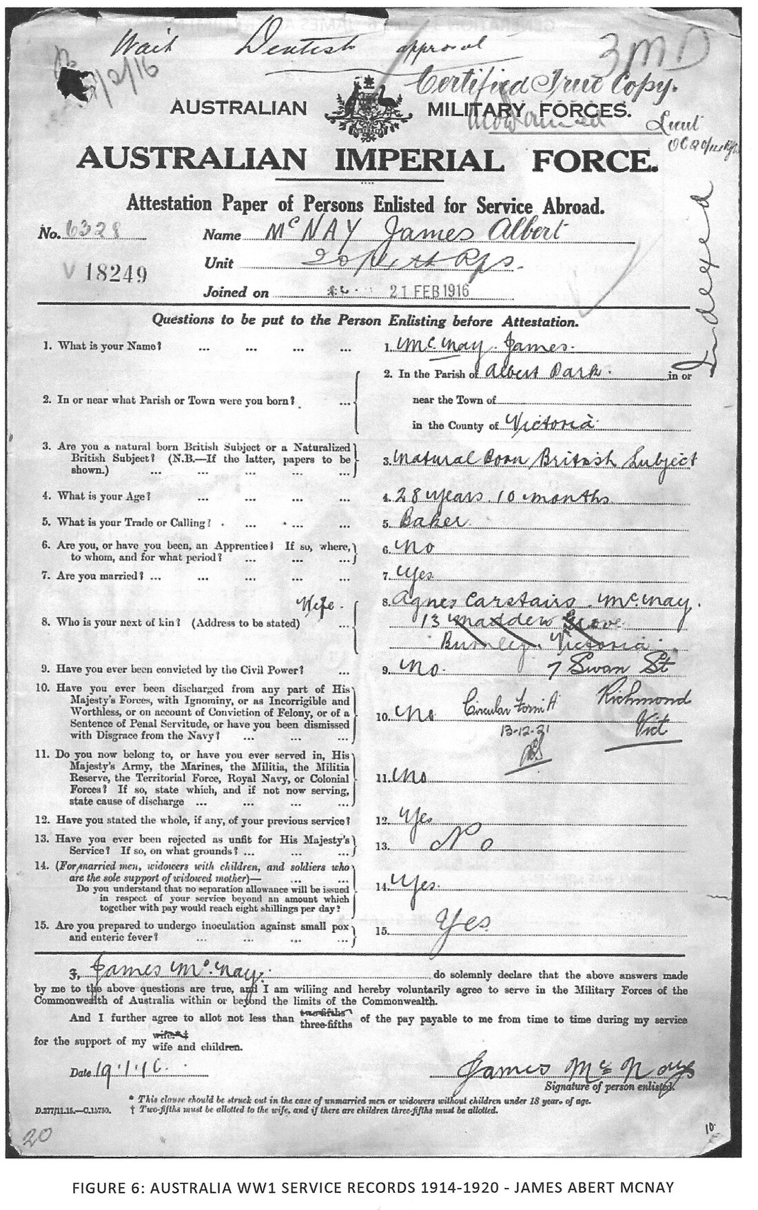 Born 1898 at Footscray, VictoriaFather George McNayMother Mary Robina NottMarriage 1923 in VictoriaSpouse Ethel Victoria BlighBorn 1901 in Footscray, VictoriaFather William BlighMother Margaret McPheeDeath 1970, June 22 in MelbourneAge at Death 69 yearsResidences 1925 - 109 Wales Street, Footscray NorthOccupation Labourer1942 - 1972 - 10 Murray Street, Yarraville1977 = Lismore Road, Cressy, Victoria