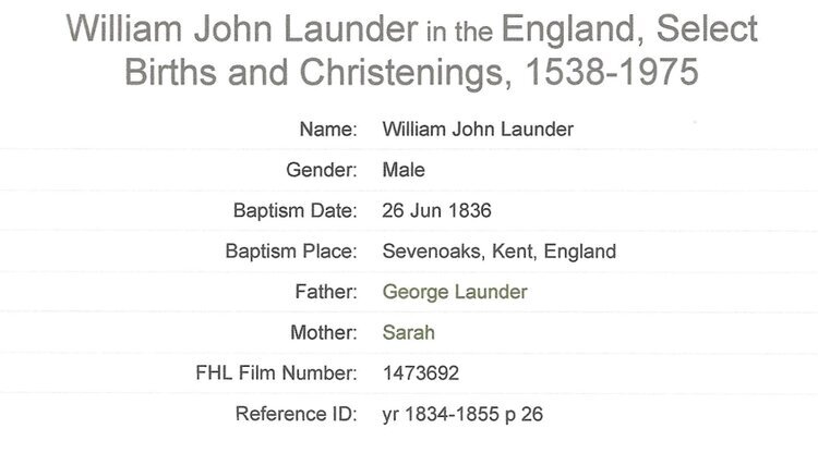 Name: George William LaunderGender: MaleBaptism Date: 5 Jun 1811Baptism Place: Sevenoaks, Kent, EnglandFather: Thomas LaunderMother: SarahFHL Film Number: 1473692Ancestry.com. England, Select Births and Christenings, 1538-1975