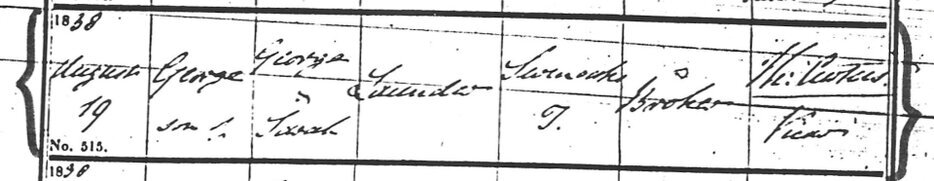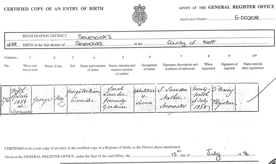 As regular as clockwork, every two years, another little Launder. This time, on July 5, 1838, a son named George born in Sevenoaks. Mother is Sarah Launder, formerly Gardiner. Father was George William Launder, Upholstered & Turner.