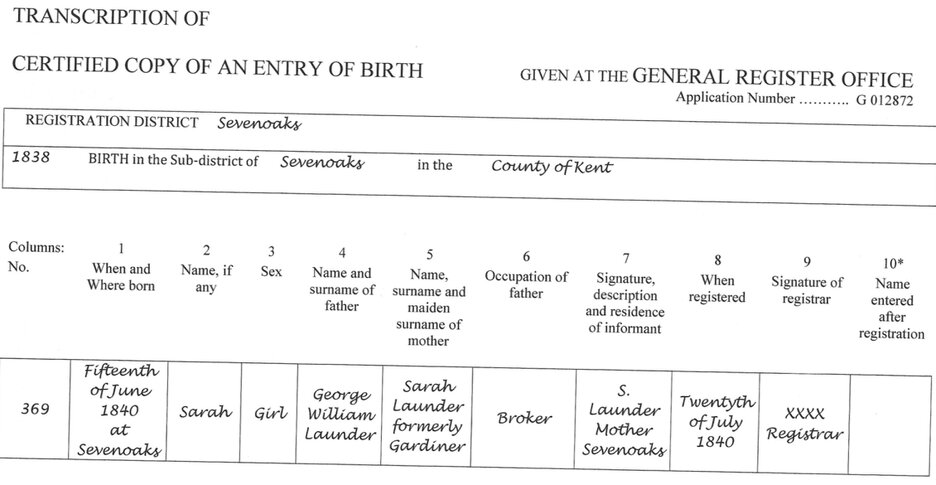 Their fourth child, another daughter, Sarah Launder, was born on June 15, 1840 in Sevenoaks. The copy of the birth certificate is not suitable to photocopy, so a transcription is shown here. Baby Sarah was baptised in the parish church in Sevenoaks on July 11, 1840.