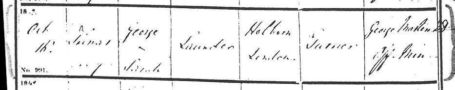 The year after the census, another Launder baby arrived – Thomas Howard Launder – George and Sarah’s fifth child. Baby Thomas was baptized on October 16 of that year, but this time, George and Sarah gave their usual place of abode as Holborn in London and George’s occupation was listed as ‘brewer’.