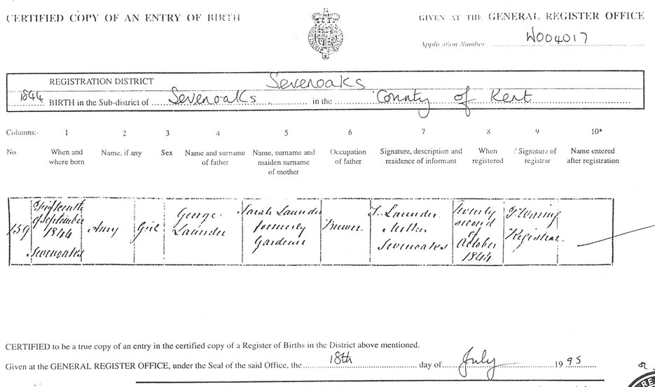 Another daughter, Amy, was born in 1844 on September 15 at Sevenoaks. Perhaps George’s stint in Holborn, London as brewer, was continuing, as Amy’s birth certificate shows George’s occupation as ‘brewer’, but the residence of Sarah as Sevenoaks.
