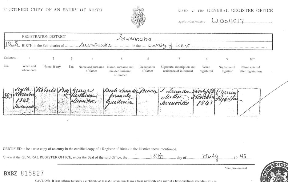 - William Roberts acknowledged his “natural daughter Sarah now the wife of George Launder of Sevenoaks aforesaid Brewer formally Sarah Gardiner spinster.”