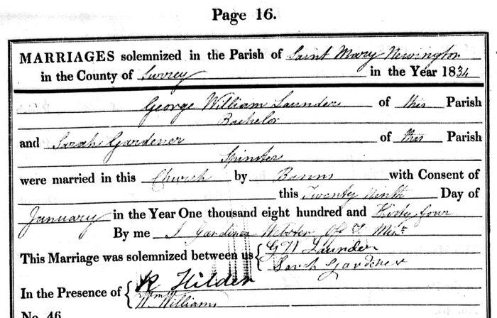 George and Sarah were both born and lived in Sevenoaks, Kent but married many miles away in Surrey at St. Mary’s Church, Newington on January 29 in 1834. George was 23 years old and Sarah 21. Other members of the Launder family were later to marry at this church so perhaps it held some relevance to the family.