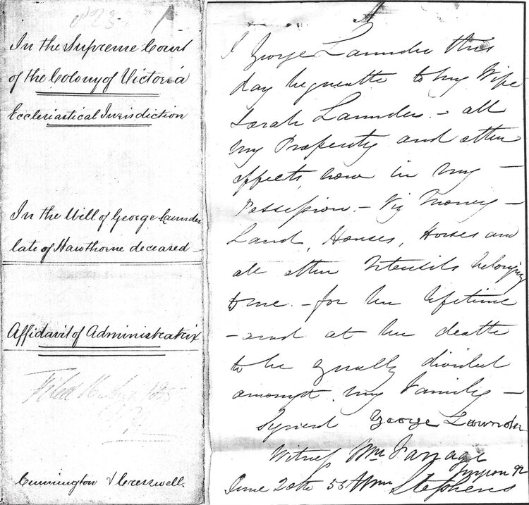 In its Ecclesiastical Jurisdiction In the Will of George Launder late of Hawthorne near the City of Melbourne In The Colony of Victoria Gentleman deceasedI Sarah Launder of Hawthorne in the Colony of Victoria make oath and say -1. That the writing herewith annexed, marked A contains the true last will of George Launder late of Hawthorne in the Colony of Victoria deceased, as far as I know or believe.2. That the said George Launder left me the said Sarah Launder his lawful widow and Eleanor, William Charles, George, Sarah, Thomas, Amy, Jane, Roberts, Henry and Mary Ann children him surviving.3. That I will faithfully administer according to the tenor of the said Will all the property of the said George Launder so far as the same will extend and the law charge me.4. That I will exhibit a full and true inventory of the property of the said George Launder and an account of the administration thereof, as I may be required by the Rules of this Honorable Court.5. That I believe the property of the said George Launder does not exceed in value Two hundred pounds and that I the said Sarah Launder am as I believe lawfully entitled to the administration thereof.Sworn at Melbourne in the ]Colony of Victoria this fourteenth ]Day of August ] S LaunderIn the year of our Lord one thousand ]Eight hundred and fifty five ]Before me A Commissioner for taking Affidavits