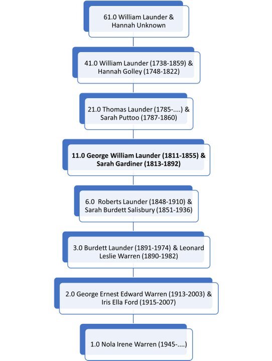 After many years of research, I have traced George William Launder’s family back to his great-grandfather, William Launder, and his wife Hannah – who were my great-great-great-great-great-grandparents! Their story can be found on another webpage. George’s grandfather was William Launder and grandmother was Hannah Golley. His parents were Thomas Launder and Sarah Puttoo – an odd name one might think, but there were many people with the surname Puttoo in Kent in that time. This is a simplified outline of George’s ancestry –Family Hierarchy