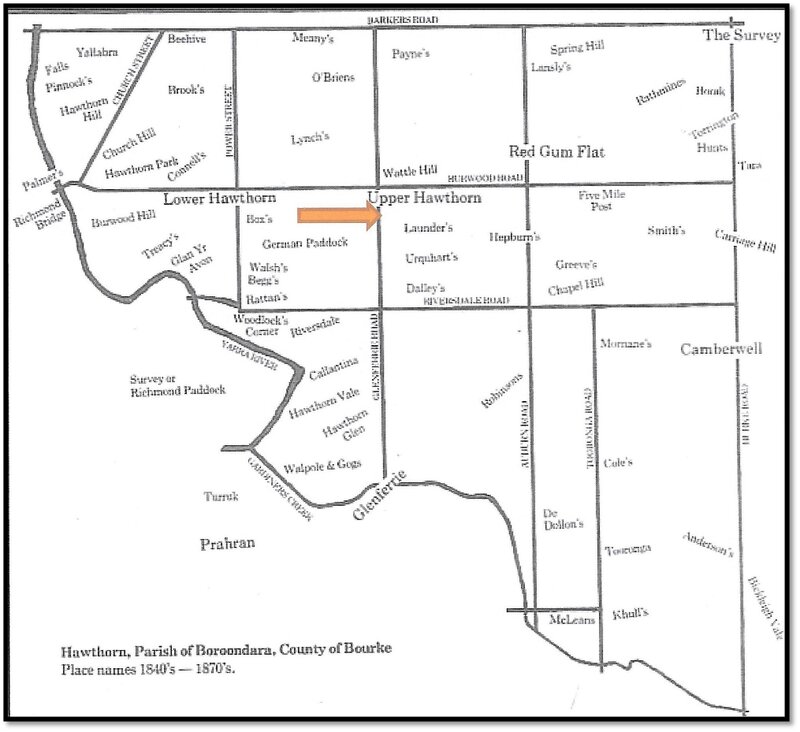 The map shows place names and street names in Hawthorn during the 1840’s to 1870’s. Launder’s allotment is indicated by the arrow.