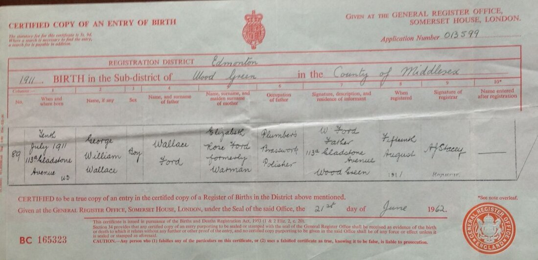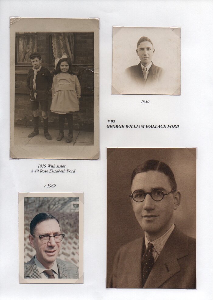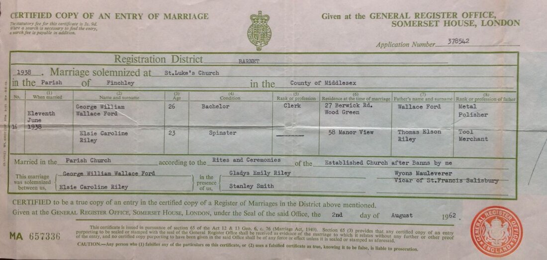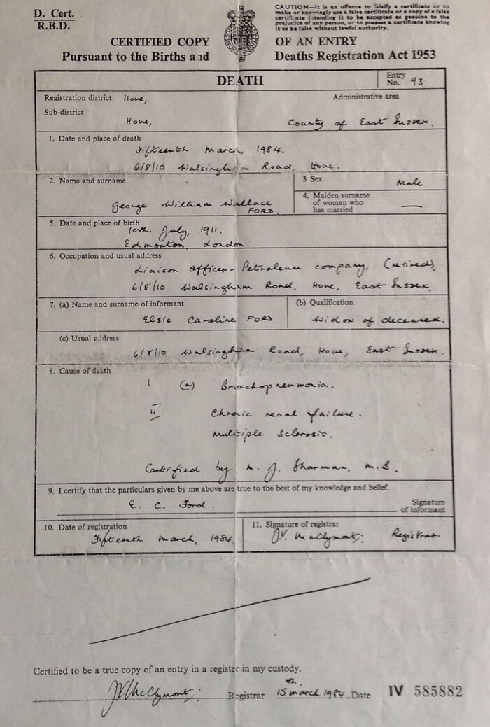 George William Wallace FordBirth 1911, July 10 Edmonton, MiddlesexBaptised 1912, Aug 30 St. Mark’s Church, Noel Park, Haringey, UKMarriage 1938, June 11 at St. Luke's Church, Finchley, MiddlesexWitnesses to Marriage Gladys Emily Riley and Stanley SmithSpouse Elsie Caroline Riley (1915-1985Born 1915Death 1985Death 1984, March 15, Hove, SussexCause of Death Bronchopneumonia, Chronic Renal Failure, Multiple SclerosisCremation Brighton Crematorium. Ashes scattered in Rose GardenAge at Death 72 yearsOccupation 1939 Manufacturing Chemist’s ClerkResidences 1938 - 27 Berwick Road, Wood Green, Middlesex1965 - 19 West Way, Edgware, Middlesex