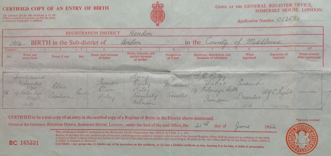 1914 - Birth Certificate, Elsie Caroline Riley