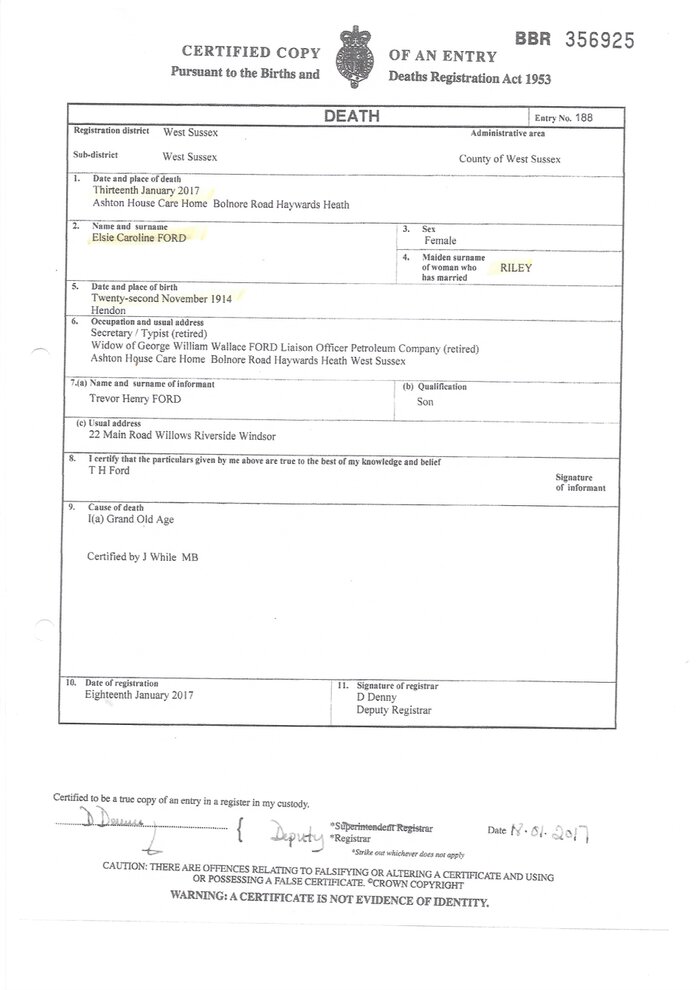 2017 - Death Certificate, Elsie Caroline Ford, nee Riley