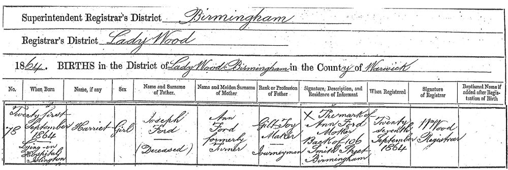 Harriet FordBirth 1864 in at Lying-in Hospital, Islington, Wolverhampton, StaffordshireBaptism 1864, May 4 at St. Mary's Church, Bilston, StaffordshireFather Joseph FordMother Ann TurnerDeathAge at DeathBurial1864 - Birth Registration, Harriet Ford