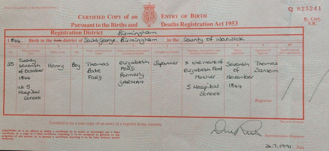 HENRY FORD Birth 1844, October 27 at 5 Hospital Street, Birmingham Baptism 1844 at St. Phillip;s Church, at Birmingham, Warwickshire Marriage 1871, June 3 at George's Church, at Birmingham, Warwickshire Witnessed to Marriage Francis Ford and Louisa Weight Spouse Emma Weight Born 1843 in Birmingham, Warwickshire Father John Weight Mother Ann Bransbury Death Occupation Cabinet Maker Residences 1851 - 5 Hospital Street, Birmingham 1881 - 70 Ryland Street, Ladywood, Warwickshire 1901 - Daisy Road, Edgbaston, Birmingham Death 1899 Children 1. Henry Ford Born 1874, April 6 at Birmingham, Warwickshire Father Henry Ford Mother Emma Weight Marriage 1900, June 2 at St. George's Church, Birmingham, Warwickshire Spouse Mary Ann Ford Witnesses to Marriage Henry Ford; Caroline Ford; Thomas Watkin Hunt Death 1921 at Birmingham, Warwickshire Age at Death 47 years Children 1. Hilda Doris Ford Born 1902 2. Arthur Henry Ford Born 1902 - Death 1963 2. Francis William Ford Born 1876, July Father Henry Ford Mother Emma Weight Marriage 1901 Spouse Agatha Maud Merrefield Born 1874, February 8 Death 1951, October 30 at Blackpool, Lancashire Residences 1881 - 1891 - Birmingham, Warwickshire 1901 - Aston, Warwickkshire 1911 - Smethwick, UK Death 1957, April at Blackpool, Lancashire, UK Children 1. Dorothy May Ford Born 1904 at Staffordshire Baptism 1904, May 22 at Birmingham, Warwickshire Father Francis William Ford Mother Agatha Maud Merrefield 2. Eric Francis Ford Born 1907, October at King's Norton, Worcestershire Father Francis William Ford Mother Agatha Maud Merrefield Death 1988, Oswestry, Shropshire 3. Emma Ford Born 1879, May 21 at Birmingham, Warwickshire Baptism 1883, August 5 at St. Barnabas, Birmingham Father Henry Ford Mother Emma Weight Marriage 1900, September 1 at St. George's Church, Edgbaston, Warwickshire Witnesses to Marriage - Henry Ford, Carrie Ford, Emma Ford, Caroline Ford Spouse Henry Ford Father Henry Ford Mother Mary Jane Gadd Death 1942, May in Birmingham |