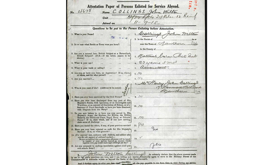 Name John Wilton CollingsAge 23Birth Year abt 1891Birth Place Hawthorn, VictoriaDossier Year Range 1914-1920Enlistment Place Melbourne, VictoriaRank Honorary LieutenantService Number 4678Father Henry John CollingsNext of Kin Henry John CollingsSource World War I Service Records, 1914-1920