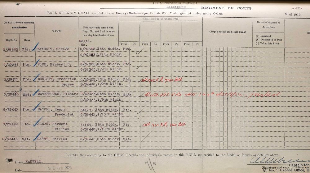 Herbert Cyril Ford joined the Duke of Cambridge's Own (Middlesex) Regiment and was awarded the British War Medal. His regimental number was G/39365. His rank was Private. He married in 1916 in his uniform.